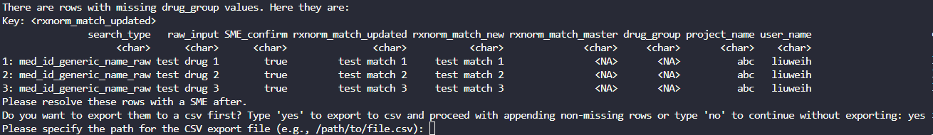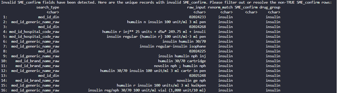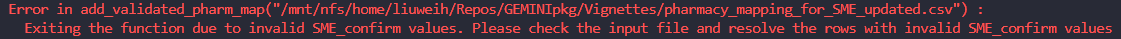 For example, if you do not filter for only SME_confirm == TRUE records, then the function will stop and ask you to resolve the invalid values. Invalid records are printed in the console - rows with SME_confirm as NA: