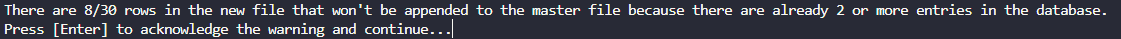 After this step (output/save the unmapped rows), the function will proceed as usual: mapped rows will be appended to the database upon ‘confirm’, while unmapped rows will not.