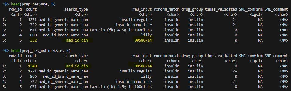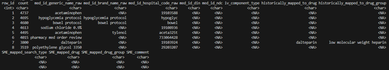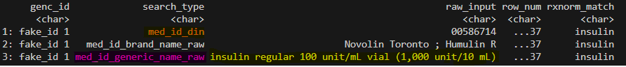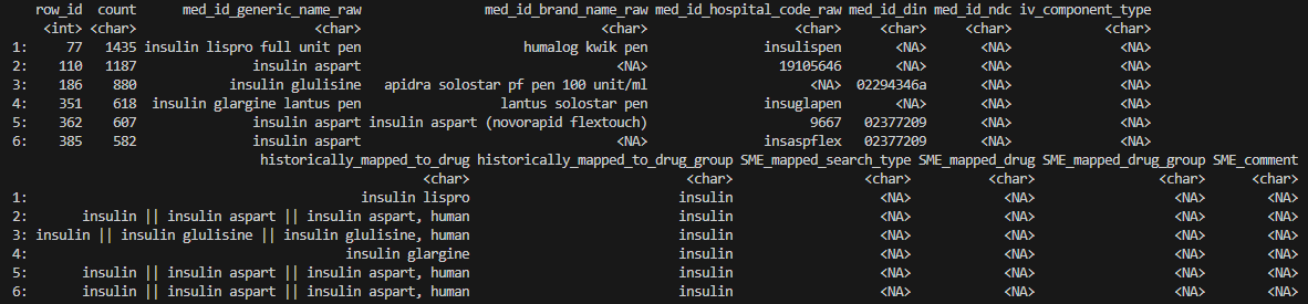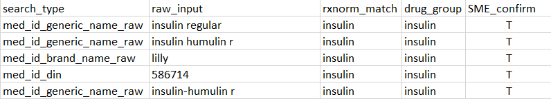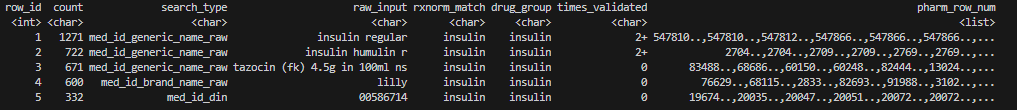 drug_name: Character vector containing generic or brand names of the drug(s) of interest. We recommend providing drug names in singular form (e.g, “insulin”, not “insulins”). Users may also inspect thelookup_pharmacy_mappingtable and align naming conventions with previously used search terms (seerxnorm_match). -